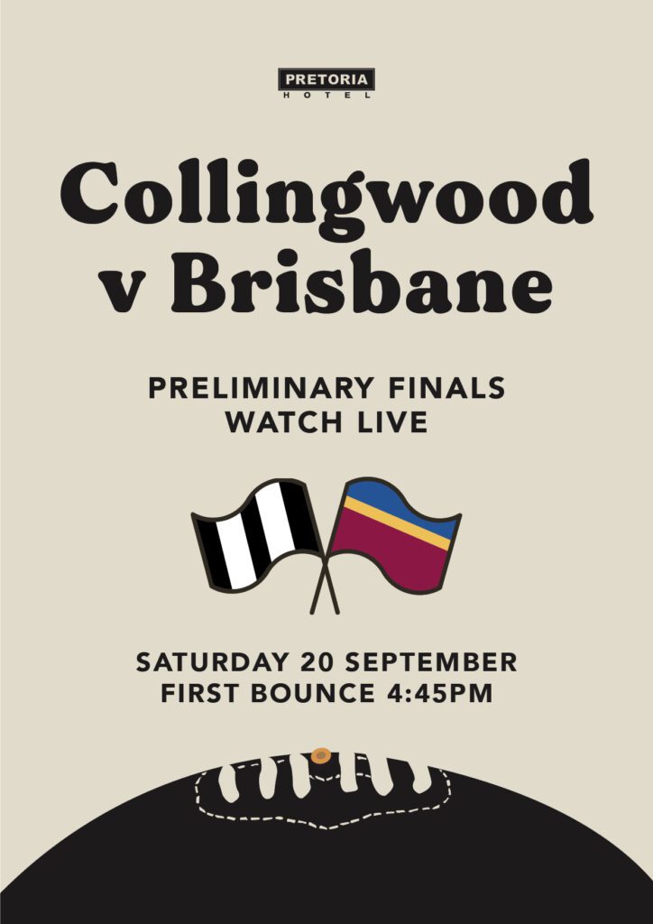 Catch all the action live this Saturday as Collingwood takes on Brisbane Lions in the AFL Prelim Final! Join us for an electric atmosphere, ice-cold drinks, and great food while you watch every goal, tackle, and moment on the big screens.