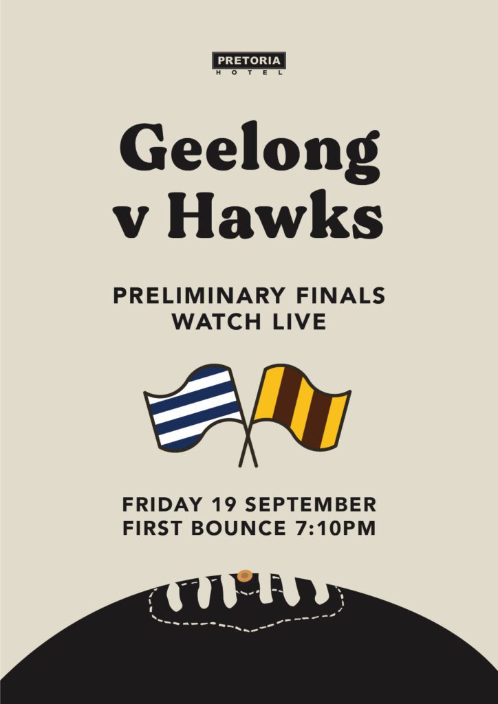 Catch all the action live this Friday as Geelong takes on Hawthorn in the AFL Prelim Final! Join us for an electric atmosphere, ice-cold drinks, and great food while you watch every goal, tackle, and moment on the big screens.
